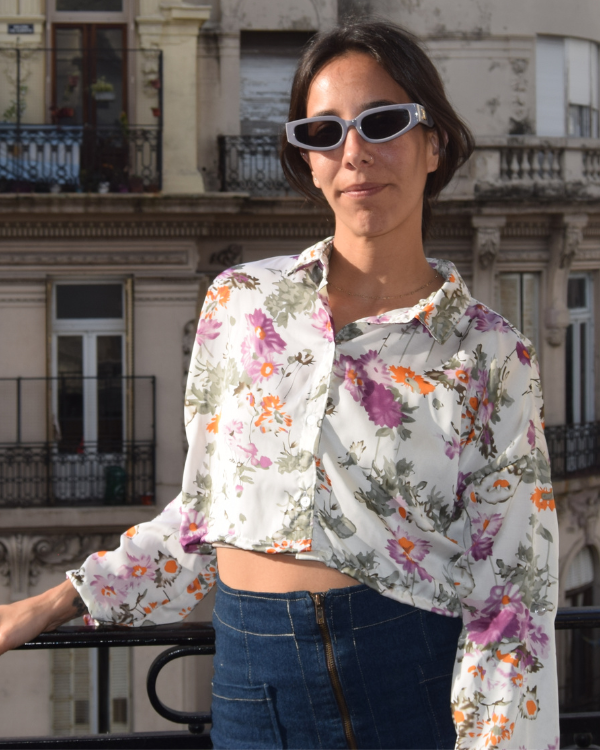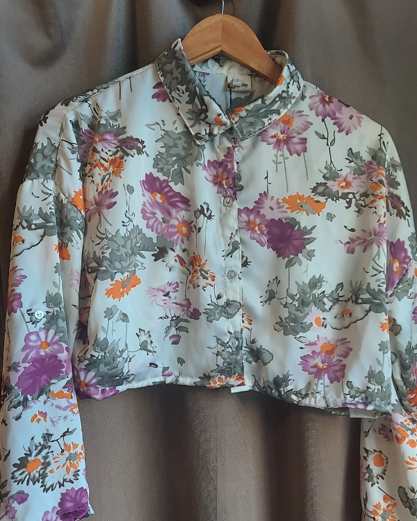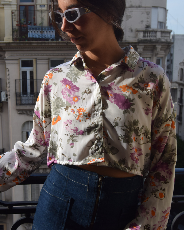 Camisa crop top de seda estampada. Es tipo mangas 3/4 y tiene un botoncito en el codo para que las puedan arremangar. Cuello italiano.