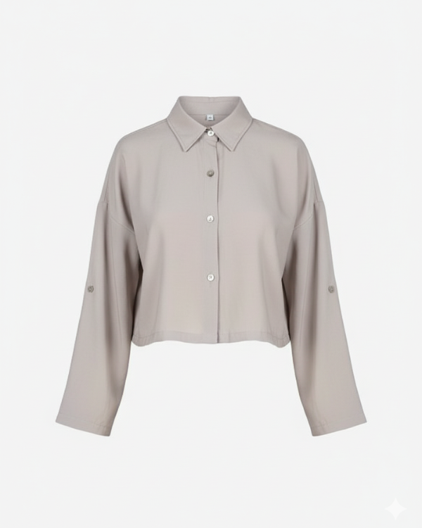 Camisa crop top de batista perla. Es tipo mangas 3/4 y tiene un botoncito en el codo para que las puedan arremangar. Cuello italiano.