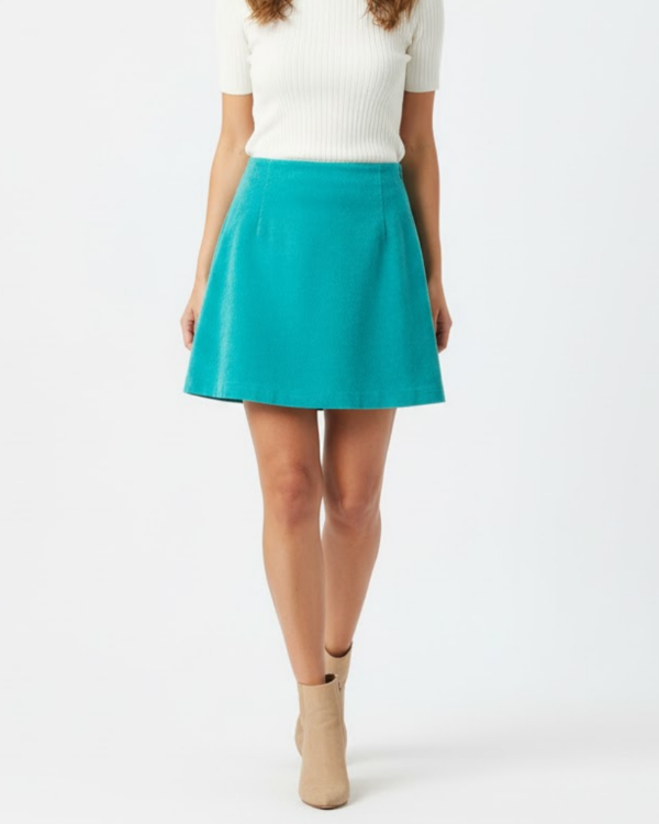 Mini falda recta con tajo al costado. Tiene elástico en los costados de la cintura, para lograr una mayor adaptación a las curvas del cuerpo.