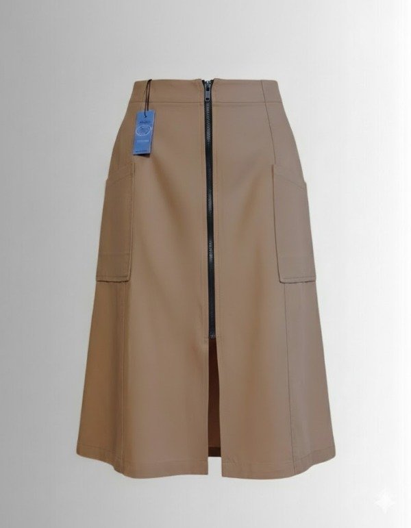 Pollera larga por debajo de las rodillas con cierre delantero y bolsillos cargo a los costados.